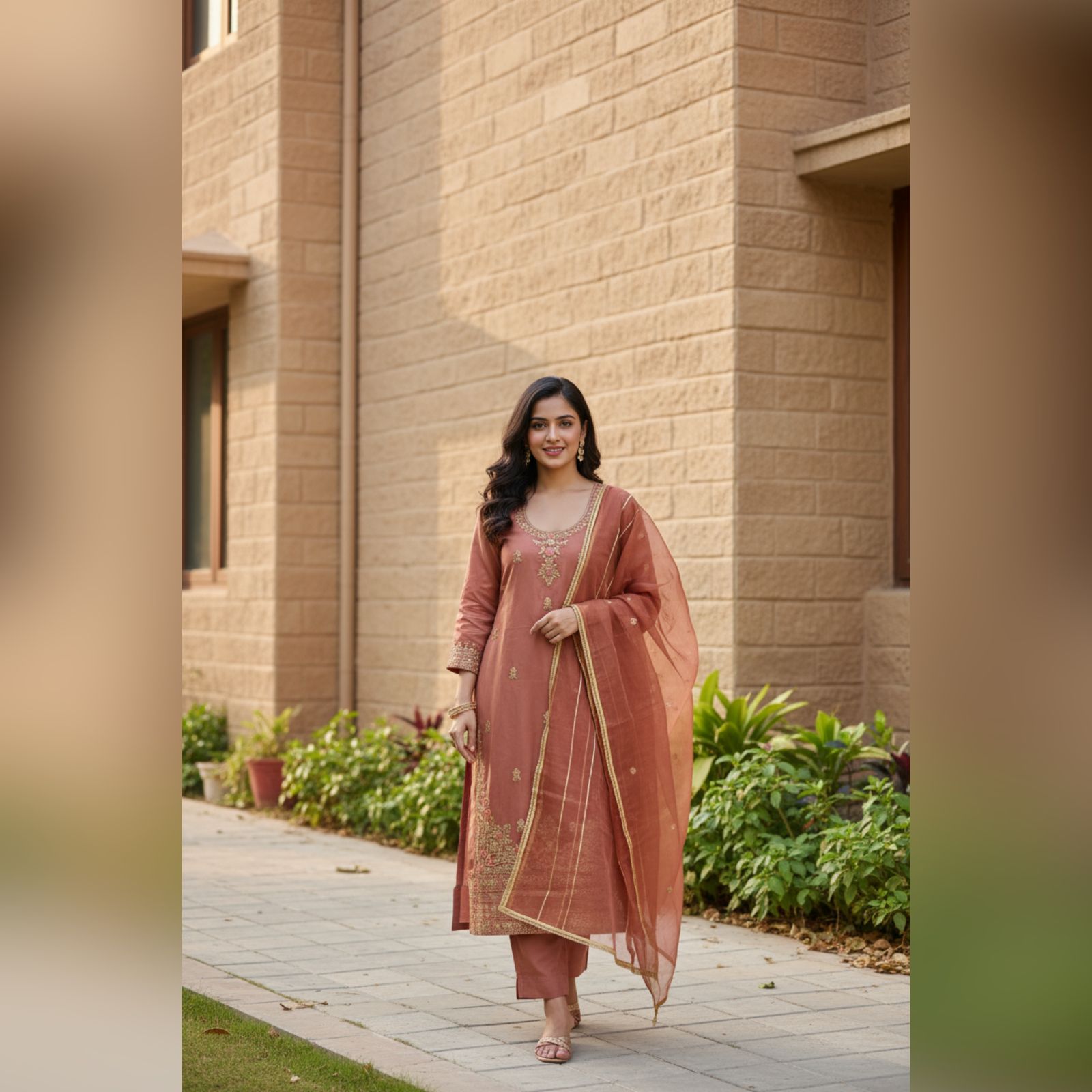 Step into a world of subtle charm with this Mauve Rose Salwar Suit Set. This ensemble features a soft, muted pink-brown hue that radiates sophistication. The kurta is beautifully accented with delicate golden floral embroidery around the neckline and a rich, wide embroidered border at the hem. Paired with matching trousers and a sheer, gold-bordered dupatta, this outfit is designed for those who love understated luxury.